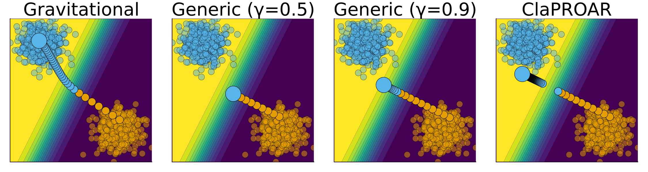 \[ \begin{aligned} \mathbf{x}_{t+1} &= \mathbf{x}_t - \nabla_{\textcolor{purple}{\mathbf{x}}} \{ {ECCCo(M_{\textcolor{orange}{\theta^*}}(\mathbf{x}),\mathbf{y^{\textcolor{purple}{+}} })} \} \\ \textcolor{purple}{\mathbf{x}^*}&=\mathbf{x}_T \end{aligned} \]