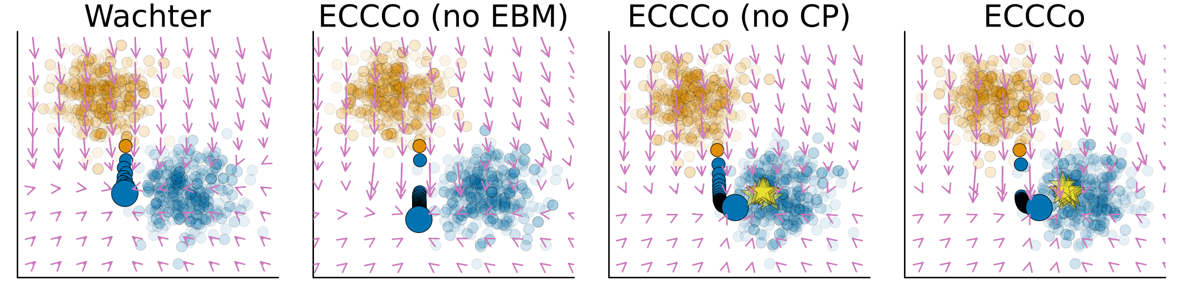 Figure 5.1 illustrates how the different components in Equation 4.9 affect the counterfactual search for a synthetic dataset. The underlying classifier is a Joint Energy Model (JEM) that was trained to predict the output class (blue or orange) and generate class-conditional samples (Grathwohl et al. 2020). We have used four different generator flavors to produce a counterfactual in the blue class for a sample from the orange class: Wachter, which only uses the first penalty (\(\lambda_2=\lambda_3=0\)); ECCCo (no EBM), which does not constrain energy (\(\lambda_2=0\)); ECCCo (no CP), which involves no set size penalty (\(\lambda_3=0\)); and, finally, ECCCo, which involves all penalties defined in Equation 4.9. Arrows indicate (negative) gradients with respect to the objective function at different points in the feature space.