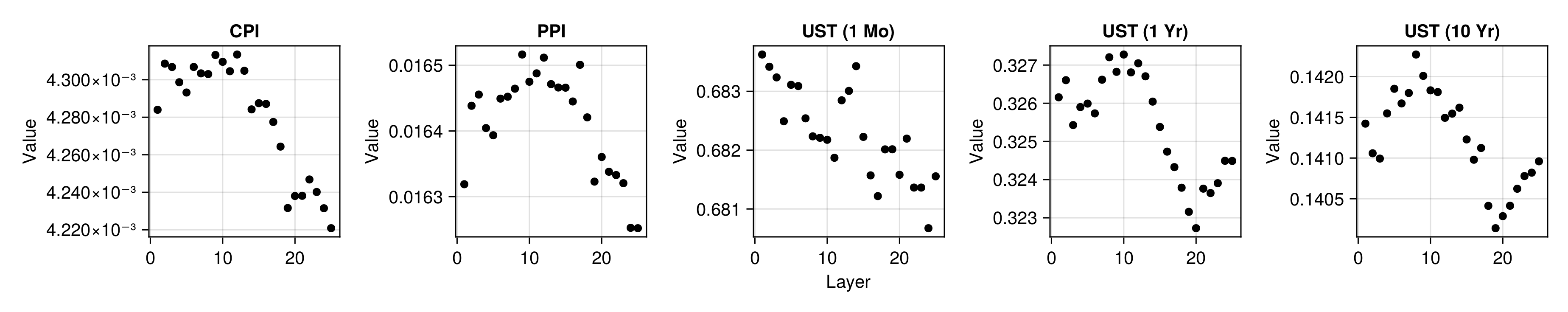 For each layer, we compute linear probes through Ridge regression on two inflation indicators (the Consumer Price Index (CPI) and the Producer Price Index (PPI)) and US Treasury yields at different levels of maturity. To allow comparison with Shah, Paturi, and Chava (2023), we let yields enter the regressions in levels. To measure price inflation we use percentage changes proxied by log differences. To mitigate issues related to over-parameterization, we follow the recommendation in Alain and Bengio (2016) to first reduce the dimensionality of the computed activations. In particular, we restrict our linear probes to the first 128 principal components of the embeddings of each layer. To account for stochasticity, we use an expanding window scheme with 5 folds for each indicator and layer. To avoid look-ahead bias, PCA is always computed on the sub-samples used for training the probe.